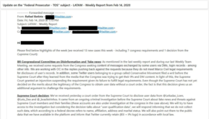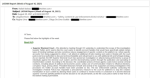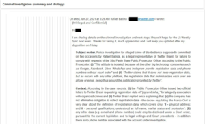 No mesmo e-mail, Batista observou que um tribunal de São Paulo exigiu que o Twitter “desmascarasse diversas contas do Twitter… relacionadas a críticas/supostas ofensas contra Fernando Capez, professor e político brasileiro, ex-deputado e atualmente secretário especial do Conselho do Consumidor de São Paulo. Agência de Proteção Civil” que foi “réu em processo criminal – recentemente Justiça Federal apreendeu milhões de reais de sua conta bancária e os Tweets estão relacionados a esses fatos. Portanto, iremos reagir contra esta ordem judicial…”