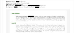 No mesmo e-mail, Batista observou que uma parlamentar chamada Gleisi Hoffmann, que preside o Partido dos Trabalhadores de Lula da Silva e que processou o Twitter por “ataques à sua honra”, buscando “dados privados e remoção de alguns Tweets”, havia finalmente desistido do processo.