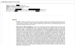 Batista enviou um e-mail a seus colegas em 14 de junho de 2021, para dizer que “o Twitter recebeu no ano passado um ‘aviso de reclamação’, que agora foi transformado em uma investigação civil contra nós”.