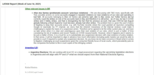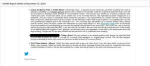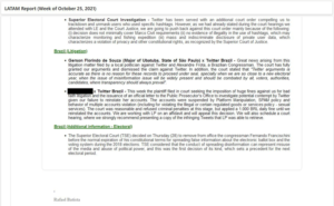 “Mesmo que esta obrigação inicialmente não nos atinja, o tribunal também determinou que Twitter, YouTube, Twitch TV, Instagram e Facebook se abstenham de sugerir algoritmicamente perfis e vídeos de conteúdo político que desacreditem o sistema eleitoral (legitimidade das eleições) em associação com esses usuários/contas e também ii) identificar a origem de conteúdo específico (não recebemos nenhum URL de Tweet específico).”