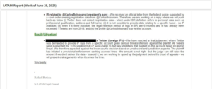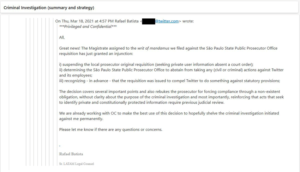 Em 11 de junho de 2021, Batista enviou um e-mail a seus colegas para dizer que o governo havia aberto uma investigação criminal contra o Twitter e que “as autoridades brasileiras estão buscando o nome e endereço do responsável pela condução do caso internamente no Twitter…”.