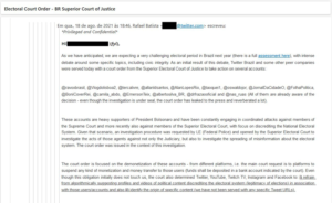 Em 18 de agosto de 2021, Batista enviou um e-mail a seus colegas para dizer que o Tribunal Superior Eleitoral exigiu que as contas de “fortes apoiadores do presidente Bolsonaro” que “têm se envolvido constantemente em ataques coordenados contra membros do Supremo Tribunal Federal” e “Superior Eleitorais Tribunal… A ordem judicial está focada na desmonetização dessas contas – de diferentes plataformas…”