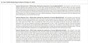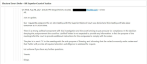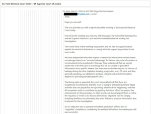 O Tribunal Superior Eleitoral (TSE) do Brasil, controlado por Moraes, também exigiu que o Twitter revelasse as identidades dos usuários. Em 25 de outubro de 2021, o consultor jurídico sênior do Twitter, Rafael Batista, enviou um e-mail a seus colegas informando que o TSE estava “obrigando-nos a rastrear e desmascarar usuários que utilizassem hashtags específicas”.