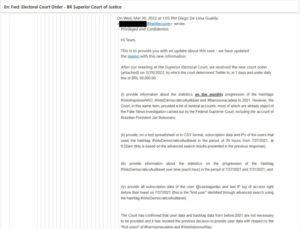 Ela acrescentou: “Recebemos vários pedidos incomuns provenientes desta investigação, o mais recente e relevante nos obrigando a fornecer uma quantidade indeterminada de dados de usuários com base em menções de hashtag. As hashtags dizem respeito a uma mobilização em torno das eleições – traduzidas aproximadamente como #VotoImpresso; #VotoDemocraticoAuditavel e #BarrosoNaPrisao – Barroso é o ex-presidente do TSE….De acordo com o relatório que temos atualmente, foram 182 tweets no período de interesse… Precisamos do conteúdo, identificadores de usuários e respectivos dados do BSI o mais rápido possível…”