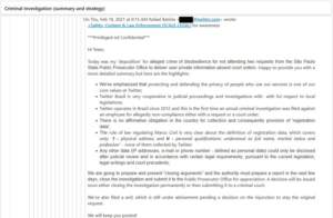 Em 18 de fevereiro de 2021, Batista enviou novamente um e-mail a seus colegas para relatar seu depoimento. Ele disse ter dito ao promotor que “o Twitter opera no Brasil desde 2012 e esta é a primeira vez que uma investigação criminal real foi aberta contra um funcionário por suposto descumprimento de uma solicitação ou de uma ordem judicial”.