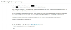 Um mês depois, em 18 de março, Batista enviou novamente um e-mail aos colegas, desta vez com “Ótimas notícias!” Um juiz rejeitou o pedido do Ministério Público de “informações privadas do utilizador na ausência de ordem judicial” e também “repreende o Ministério Público por forçar o cumprimento através de uma obrigação inexistente, sem clareza sobre o objetivo da investigação criminal e, o mais importante, reforçando que atos que procuram para identificar informações privadas e protegidas constitucionalmente requerem revisão judicial prévia.”