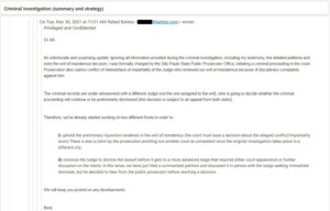 Então, no dia 30 de março, Batista enviou novamente um e-mail aos colegas com “Uma atualização infeliz e surpreendente”: o Ministério Público do Estado de São Paulo voltou ao ataque, “iniciando um processo criminal” e alegando “conflito de interesses/falta de imparcialidade” do Juiz.”