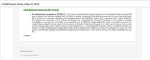 Em 31 de maio de 2021, Batista escreveu a seus colegas para lamentar que “o Google entregou ao Senado brasileiro pelo menos 200 gigs de vídeos que foram excluídos do YouTube por pessoas ligadas ao governo federal” conectados a uma investigação do Senado brasileiro sobre o governo federal e relacionados à COVID-19.