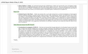Em 14 de fevereiro de 2020, o consultor jurídico do Twitter no Brasil, Rafael Batista, enviou um e-mail a seus colegas para descrever uma audiência no Congresso sobre “Desinformação e ‘notícias falsas’”