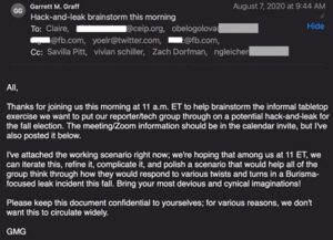 No Twitter Files: Garret Graff, chefe da Aspen Digital, enviou um e-mail de convite para Facebook, First Draft, Twitter, The Carnegie Endowment for International Peace, Yahoo! Notícias e outros. Ele afirma “Traga suas imaginações mais desonestas e cínicas! Por favor, mantenha este documento confidencial para vocês; por várias razões, não queremos que isso circule amplamente.”
