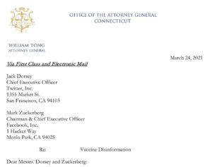 No #TwitterFiles: 12 Procuradores-Gerais escrevem para o Twitter e o Facebook em 24 de março de 2021, pedindo-lhes que tomem medidas contra “Os doze desinformantes”, referindo-se ao Centro de Combate ao Ódio Digital. Eles declaram: “À medida que vacinas seguras e eficazes se tornam disponíveis, o fim desta pandemia está à vista.” Em 1º de abril, dias depois, o Twitter adiciona rótulos e dá strikes em todas as contas, além de suspender permanentemente uma pessoa.