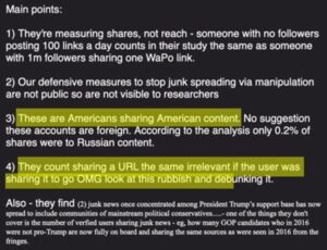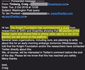 No #TwitterFiles: Em outubro de 2018, em uma demonstração clássica de como os grupos CIC influenciam tanto a moderação de conteúdo quanto a cobertura de notícias, o Washington Post escreve no Twitter e cita um estudo da Knight Foundation afirmando que 80% das contas que espalharam desinformação em 2016 ainda estão no ar. O Twitter tem dois dias para responder a essa consulta, que segue um padrão que o Twitter já conhecia muito bem: “O estudo X diz que você não fez o suficiente para impedir Y. Publicaremos em Z horas…”